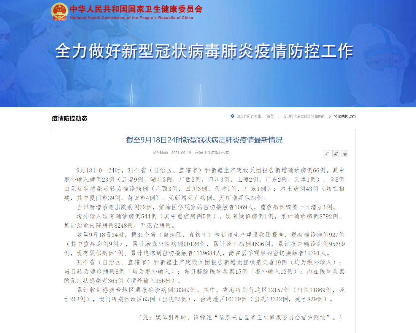 香港新聞網9月19日電 據國家衛健委網站19日消息,9月18日0—24時,31個省(自治區、直轄市)和新疆生產建設兵團報告新增確診病例66例。其中境外輸入病例23例(雲南9例,湖北3例,廣西3例,四川3例,上海2例,廣東2例,天津1例),含8例由無癥狀感染者轉為確診病例(廣西3例,四川3例,天津1例,廣東1例);本土病例43例(均在福建,其中廈門市39例、莆田市4例)。無新增死亡病例。無新增疑似病例。 當日新增...