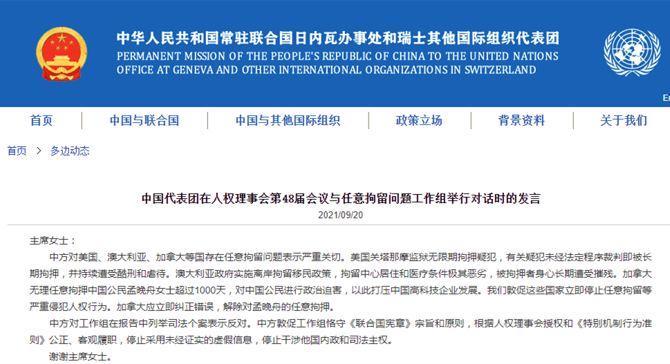 中國代表:對美等西方國任意拘押行為表達嚴重關切