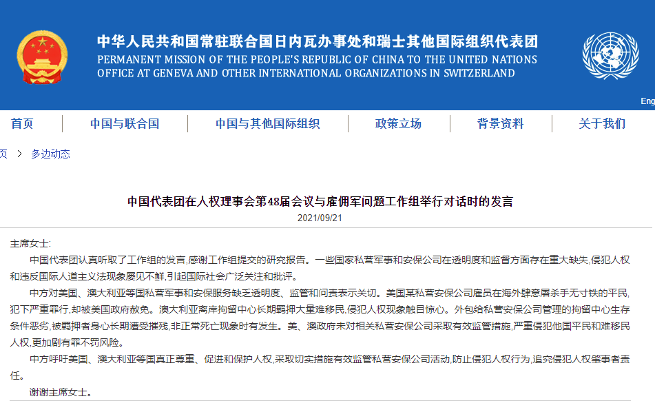 中國代表在聯合國人權理事會敦促美澳有效監管私營安保公司