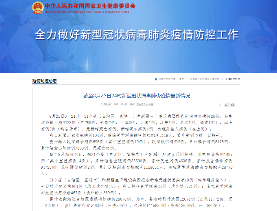 香港新聞網8月26日電 據國家衛生健康委員會官方網站消息,8月25日0—24時,31個省(自治區、直轄市)和新疆生產建設兵團報告新增確診病例26例,其中境外輸入病例23例(廣東9例,雲南7例,上海3例,天津1例,遼寧1例,浙江1例,福建1例),本土病例3例(均在雲南);無新增死亡病例;新增疑似病例1例,為境外輸入病例(在上海)。 當日新增治愈出院病例104例,解除醫學觀察的密切接觸者3119人,重癥病例與前一日...