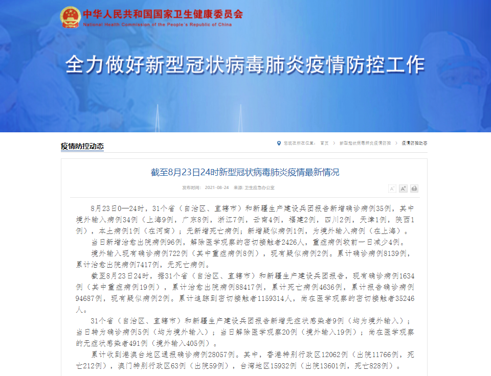香港新聞網8月24日電 據國家衛生健康委員會官方網站消息,8月23日0—24時,31個省(自治區、直轄市)和新疆生產建設兵團報告新增確診病例35例,其中境外輸入病例34例(上海9例,廣東8例,浙江7例,雲南4例,福建2例,四川2例,天津1例,陜西1例),本土病例1例(在河南);無新增死亡病例;新增疑似病例1例,為境外輸入病例(在上海)。 當日新增治愈出院病例96例,解除醫學觀察的密切接觸者2426人,重癥病例較...
