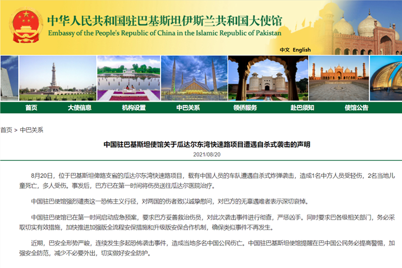 香港新聞網8月21日電 據中國駐巴基斯坦大使館網站消息,8月20日,位於巴基斯坦俾路支省的瓜達爾東灣快速路項目,載有中國人員的車隊遭遇自殺式炸彈襲擊,造成1名中方人員受輕傷,2名當地兒童死亡,多人受傷。事發後,巴方已在第一時間將傷員送往瓜達爾醫院治療。 中國駐巴使館強烈譴責這一恐怖主義行徑,對兩國的傷者致以誠摯慰問,對巴方的無辜遇難者表示深切哀悼。 中國駐巴使館已在第一時間啟動應急預案,要求巴方妥善救治傷員,...