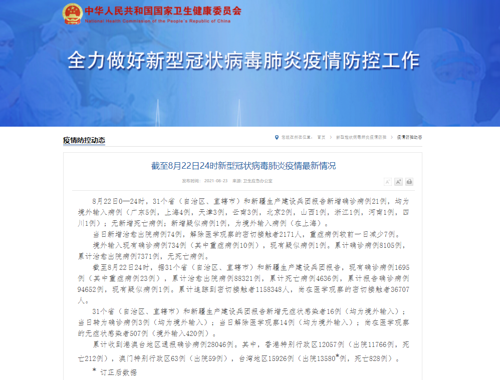 香港新聞網8月23日電 據國家衛生健康委員會官方網站消息,8月22日0—24時,31個省(自治區、直轄市)和新疆生產建設兵團報告新增確診病例21例,均為境外輸入病例(廣東5例,上海4例,天津3例,雲南3例,北京2例,山西1例,浙江1例,河南1例,四川1例);無新增死亡病例;新增疑似病例1例,為境外輸入病例(在上海)。 當日新增治愈出院病例74例,解除醫學觀察的密切接觸者2171人,重癥病例較前一日減少7例。 ...