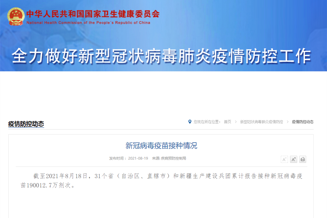 香港新聞網8月19日電 據中國國家衛健委網站19日消息,截至2021年8月18日,31個省(自治區、直轄市)和新疆生產建設兵團累計報告接種新冠病毒疫苗190012.7萬劑次。