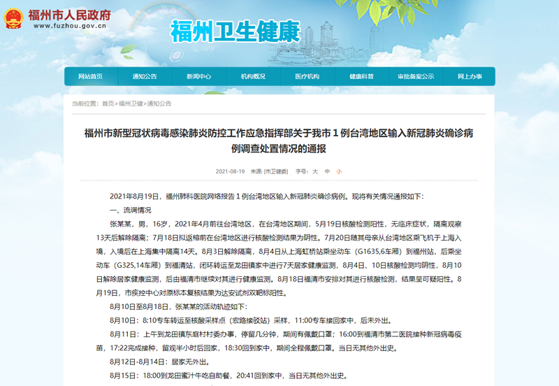 香港新聞網8月20日電 據福州市人民政府網站8月19日發佈《福州市新型冠狀病毒感染肺炎防控工作應急指揮部關於我市1例台灣地區輸入新冠肺炎確診病例調查處置情況的通報》: 2021年8月19日,福州肺科醫院網絡報告1例台灣地區輸入新冠肺炎確診病例。現將有關情況通報如下: 一、流調情況 張某某,男,16歲,2021年4月前往台灣地區,在台灣地區期間,5月19日核酸檢測陽性,無臨床癥狀,隔離觀察13天後解除隔離;7...