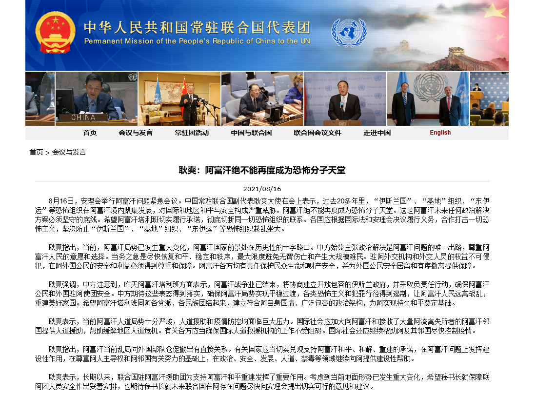 香港新聞網8月17日電 據中國駐歐盟代表團網站消息,8月16日,安理會舉行阿富汗問題緊急會議。中國常駐聯合國副代表耿爽大使在會上表示,過去20多年裏,“伊斯蘭國”、“基地”組織、“東伊運”等恐怖組織在阿富汗境內聚集發展,對國際和地區和平與安全構成嚴重威脅。阿富汗絕不能再度成為恐怖分子天堂。這是阿富汗未來任何政治解決方案必須堅守的底線。希望阿富汗塔利班切實履行承諾,徹底切斷同一切恐怖組織的聯繫。各國應根據國際法和安...