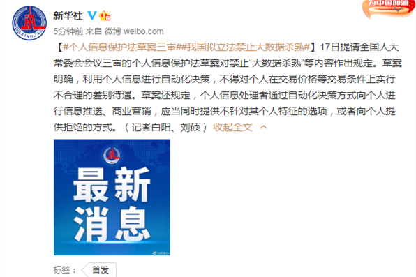 17日提請全國人大常委會會議三審的個人信息保護法草案對禁止“大數據殺熟”等內容作出規定。草案明確,利用個人信息進行自動化決策,不得對個人在交易價格等交易條件上實行不合理的差別待遇。草案還規定,個人信息處理者通過自動化決策方式向個人進行信息推送、商業營銷,應當同時提供不針對其個人特征的選項,或者向個人提供拒絕的方式。 (原標題:個人信息保護法草案三審 我國擬立法禁止大數據殺熟)