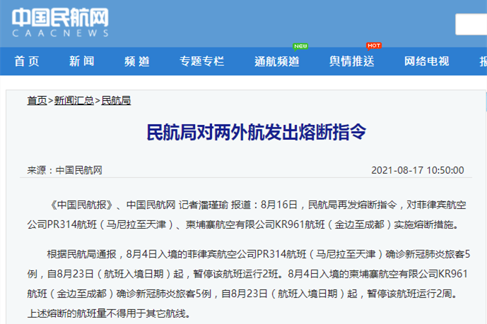 香港新聞網8月17日電 據中國民航局網站17日消息,8月16日,民航局再發熔斷指令,對菲律賓航空公司PR314航班(馬尼拉至天津)、柬埔寨航空有限公司KR961航班(金邊至成都)實施熔斷措施。 根據民航局通報,8月4日入境的菲律賓航空公司PR314航班(馬尼拉至天津)確診新冠肺炎旅客5例,自8月23日(航班入境日期)起,暫停該航班運行2班。8月4日入境的柬埔寨航空有限公司KR961航班(金邊至成都)確診新冠肺炎...