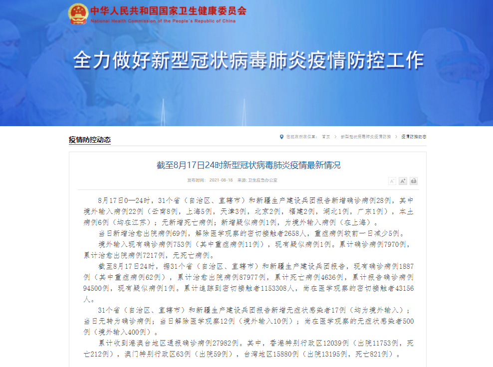 香港新聞網8月18日電 據國家衛生健康委員會官方網站消息,8月17日0—24時,31個省(自治區、直轄市)和新疆生產建設兵團報告新增確診病例28例,其中境外輸入病例22例(雲南8例,上海5例,天津3例,北京2例,福建2例,湖北1例,廣東1例),本土病例6例(均在江蘇);無新增死亡病例;新增疑似病例1例,為境外輸入病例(在上海)。 當日新增治愈出院病例69例,解除醫學觀察的密切接觸者2658人,重癥病例較前一日減...