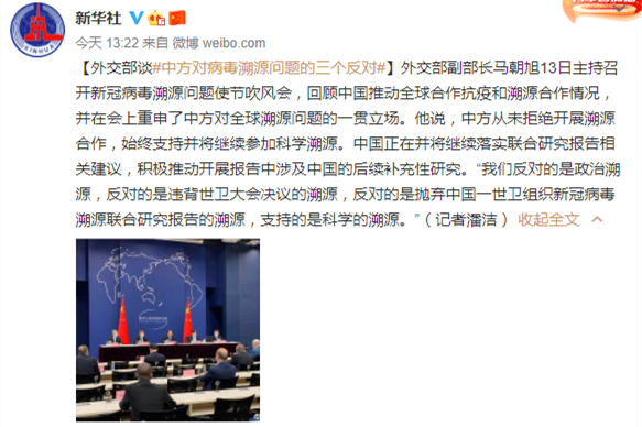 外交部副部長馬朝旭13日主持召開新冠病毒溯源問題使節吹風會,回顧中國推動全球合作抗疫和溯源合作情況,並在會上重申了中方對全球溯源問題的一貫立場。他說,中方從未拒絕開展溯源合作,始終支持並將繼續參加科學溯源。中國正在並將繼續落實聯合研究報告相關建議,積極推動開展報告中涉及中國的後續補充性研究。“我們反對的是政治溯源,反對的是違背世衛大會決議的溯源,反對的是拋棄中國一世衛組織新冠病毒溯源聯合研究報告的溯源,支持的是科...
