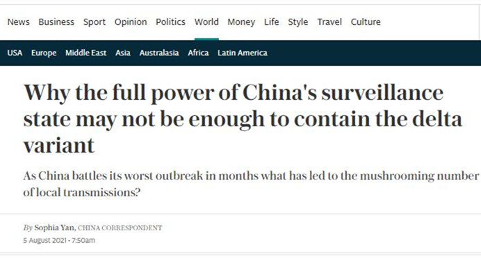 繼昨日後,中國駐英國大使館8月14日又公佈一封給英國創刊超百年的《每日電訊報》公開信《事實就是事實》,再批其涉華錯誤文章,全文如下: 8月5日,《每日電訊報》發表了記者Sophia Yan題為《為什麽中國用盡監控國家所有能量卻不能控制德爾塔變異病毒?》的文章。從題目就可看出,作者假借報道德爾塔變異病毒輸入中國情況,公然指責中國是“監控國家”,並斷言中國的政治制度不可能控制住新病毒的蔓延。細讀全文,更能感受到作者...