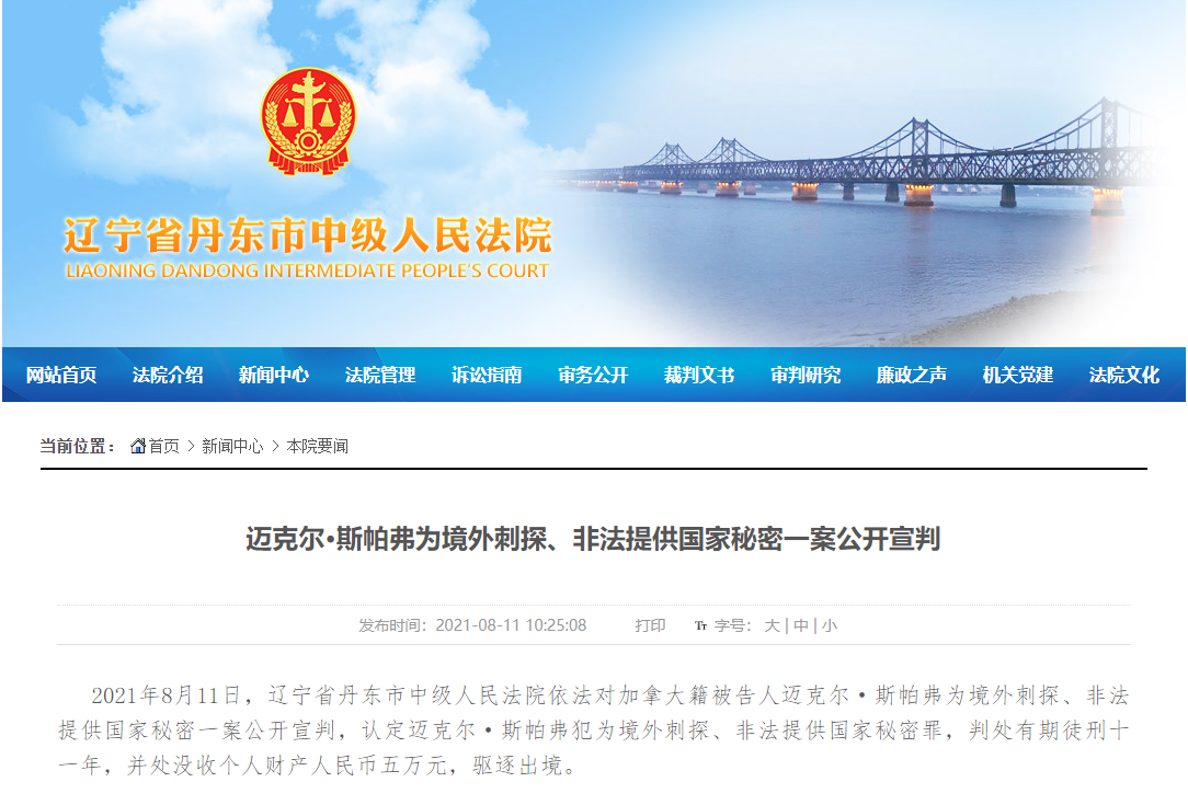香港新聞網8月11日電 據遼寧省丹東市中級人民法院消息,2021年8月11日,遼寧省丹東市中級人民法院依法對加拿大籍被告人邁克爾·斯帕弗為境外刺探、非法提供國家秘密一案公開宣判,認定邁克爾·斯帕弗犯為境外刺探、非法提供國家秘密罪,判處有期徒刑十一年,並處沒收個人財產人民幣五萬元,驅逐出境。
