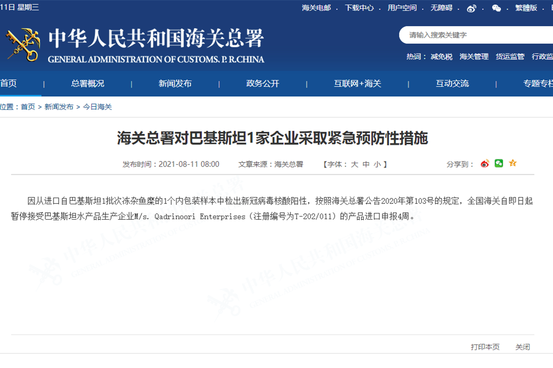 香港新聞網8月11日電 據中國海關總署網站11日消息,因從進口自巴基斯坦1批次凍雜魚糜的1個內包裝樣本中檢出新冠病毒核酸陽性,按照海關總署公告2020年第103號的規定,全國海關自即日起暫停接受巴基斯坦水產品生產企業M/s. Qadrinoori Enterprises(註冊編號為T-202/011)的產品進口申報4周。