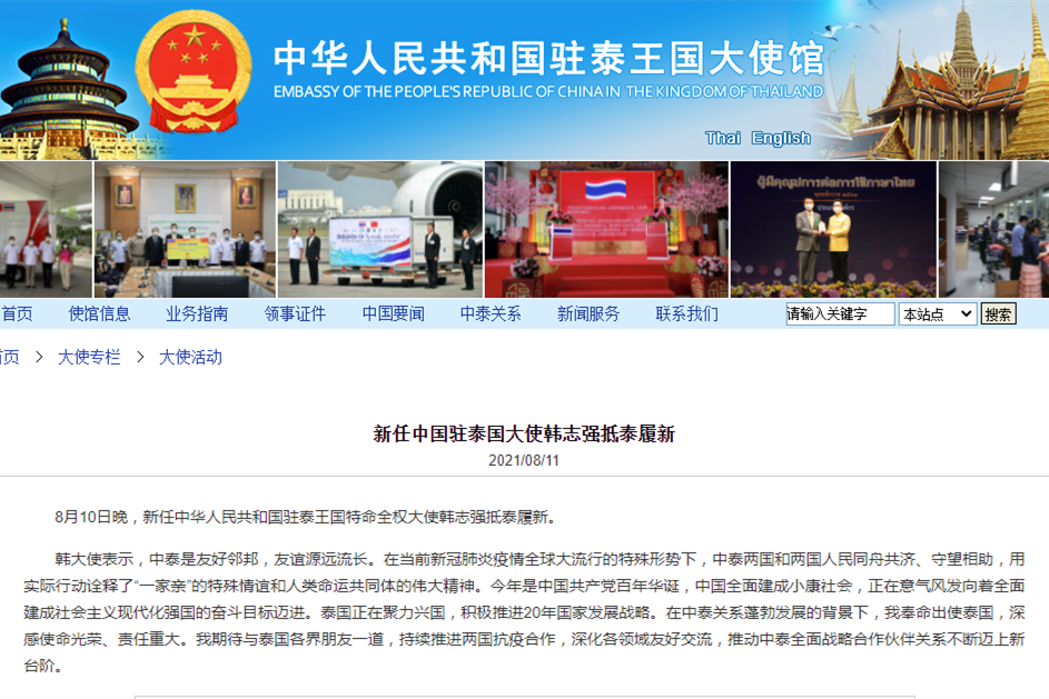 香港新聞網8月11日電 據中國駐泰國大使館8月11日消息,曼谷當地時間10日晚,新任中華人民共和國駐泰王國特命全權大使韓志強抵泰履新。 韓志強表示,中泰是友好鄰邦,友誼源遠流長。在當前新冠肺炎疫情全球大流行的特殊形勢下,中泰兩國和兩國人民同舟共濟、守望相助,用實際行動詮釋了“一家親”的特殊情誼和人類命運共同體的偉大精神。 他說,今年是中國共產黨百年華誕,中國全面建成小康社會,正在意氣風發向著全面建成社會主義現...