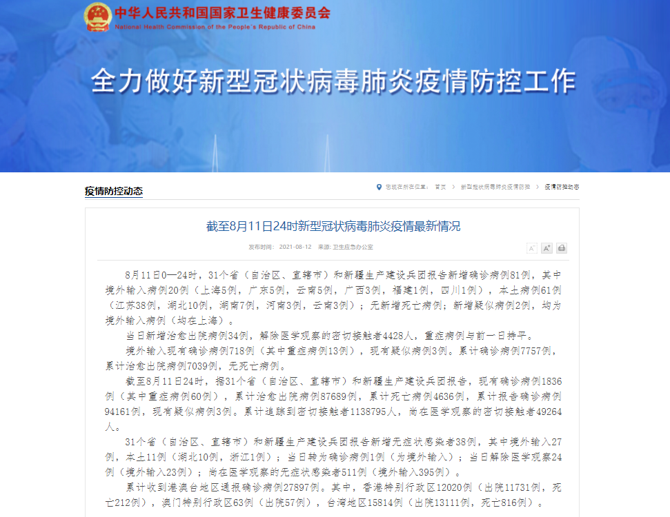 香港新聞網8月12日電 據國家衛生健康委員會官方網站消息,8月11日0—24時,31個省(自治區、直轄市)和新疆生產建設兵團報告新增確診病例81例,其中境外輸入病例20例(上海5例,廣東5例,雲南5例,廣西3例,福建1例,四川1例),本土病例61例(江蘇38例,湖北10例,湖南7例,河南3例,雲南3例);無新增死亡病例;新增疑似病例2例,均為境外輸入病例(均在上海)。 當日新增治愈出院病例34例,解除醫學觀察的...