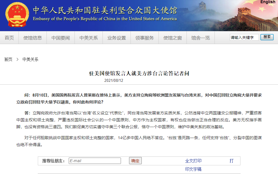 香港新聞網8月12日電 據中國駐美國大使館官網12日消息,中國駐美國大使館發言人就美方涉台言論答記者問。 問:8月10日,美國國務院發言人普萊斯在推特上表示,美方支持立陶宛等歐洲盟友發展與台灣關係,對中國召回駐立陶宛大使並要求立政府召回駐華大使予以譴責。你對此有何評論? 答:立陶宛政府允許台灣當局以“台灣”名義設立“代表處”,同台灣當局發展官方實質關係,公然違背中立兩國建交公報精神,嚴重損害中國主權和領土完整...