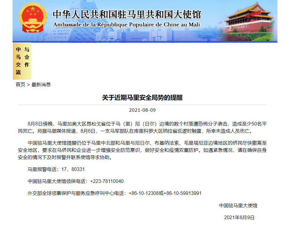 香港新聞網8月10日電 據新華社報道,馬里官方媒體9日報道說,該國北部加奧大區昂松戈省幾個村莊8日遭不明身份武裝人員襲擊,造成51名平民死亡,另有多人受傷。中國駐馬里使館9日發佈安全提醒,提醒仍在馬里北部及邊境地區的中國公民盡快撤離至安全地區。 媒體援引當地政府部門消息說,8日,一夥不明身份的武裝人員襲擊了鄰近馬里和尼日爾邊境的4個村莊,造成51名平民死亡、多人受傷,其中12人傷勢嚴重。襲擊者洗劫村莊後縱火逃跑...