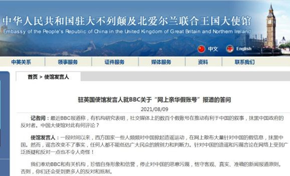 駐英使館:奉勸BBC和有關機構停止對中國的惡意汙蔑