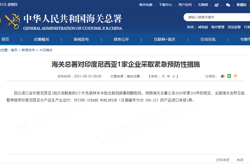 香港新聞網8月5日電 據中國海關總署5日消息,因從進口自印度尼西亞1批次凍魷魚的2個外包裝樣本中檢出新冠病毒核酸陽性,按照海關總署公告2020年第103號的規定,全國海關自即日起暫停接受印度尼西亞水產品生產企業PT. UTITED OCEANS WORLDWIDE(註冊編號為CR 386-12)的產品進口申報1周。