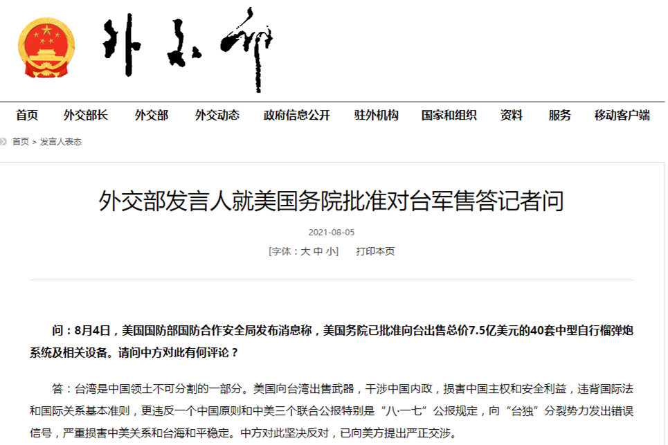 香港新聞網8月5日電 據中國外交部網站8月5日消息,外交部發言人就美國務院批準對台軍售答記者問。 問:8月4日,美國國防部國防合作安全局發佈消息稱,美國務院已批準向台出售總價7.5億美元的40套中型自行榴彈炮系統及相關設備。請問中方對此有何評論? 答:台灣是中國領土不可分割的一部分。美國向台灣出售武器,幹涉中國內政,損害中國主權和安全利益,違背國際法和國際關系基本準則,更違反一個中國原則和中美三個聯合公報特別...