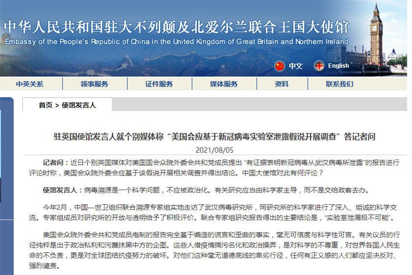 駐英使館:病毒溯源應當由科學家主導,而不是交給政客去辦