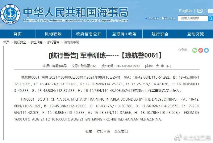 航行警告!南海部分海域8月6日至10日軍事訓練,禁止駛入