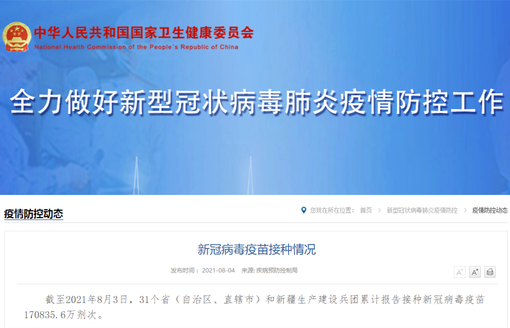 香港新聞網8月4日電 據中國國家衛健委網站4日消息,截至2021年8月3日,31個省(自治區、直轄市)和新疆生產建設兵團累計報告接種新冠病毒疫苗170835.6萬劑次。