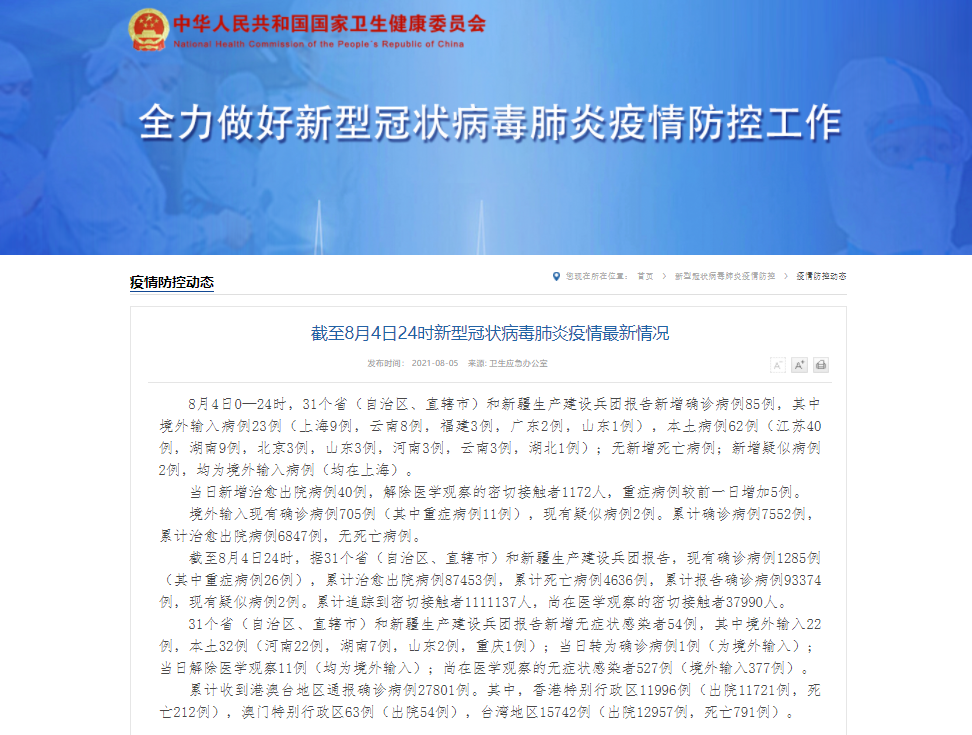 香港新聞網8月5日電 據國家衛健委網站消息,8月4日0—24時,31個省(自治區、直轄市)和新疆生產建設兵團報告新增確診病例85例,其中境外輸入病例23例(上海9例,雲南8例,福建3例,廣東2例,山東1例),本土病例62例(江蘇40例,湖南9例,北京3例,山東3例,河南3例,雲南3例,湖北1例);無新增死亡病例;新增疑似病例2例,均為境外輸入病例(均在上海)。 當日新增治愈出院病例40例,解除醫學觀察的密切接觸...