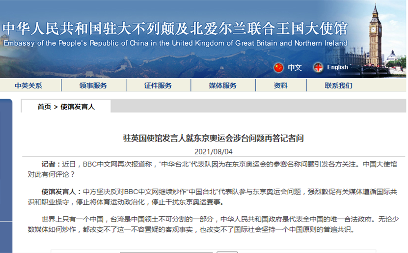 香港中通社8月4日電 中國駐英國使館發言人就東京奧運會涉台問題再答記者提問表示,中方堅決反對BBC(英國廣播公司)將體育運動政治化。 記者問:近日,BBC中文網再次報道稱,“中華台北”代表隊因為在東京奧運會的參賽名稱問題引發各方關注。中國大使館對此有何評論? 使館發言人表示,中方堅決反對BBC中文網繼續炒作“中國台北”代表隊參與東京奧運會問題,強烈敦促有關媒體遵循國際共識和職業操守,停止將體育運動政治化,停止...