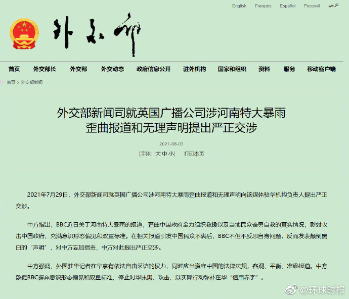 香港中通社8月3日電 8月3日,中國外交部新聞司就英國廣播公司(BBC)日前涉河南特大暴雨歪曲報道和無理聲明向該媒體駐華機構負責人提出嚴正交涉。 中方指出,7月29日,BBC關於河南特大暴雨的報道,歪曲中國政府全力組織救援以及當地民眾奮勇自救的真實情況,影射攻擊中國政府,充滿意識形態偏見和雙重標準。在相關報道引發中國民眾不滿後,BBC不但不反思自身問題,反而發表顛倒黑白的“聲明”,對中方妄加指責,中方對此提出嚴...