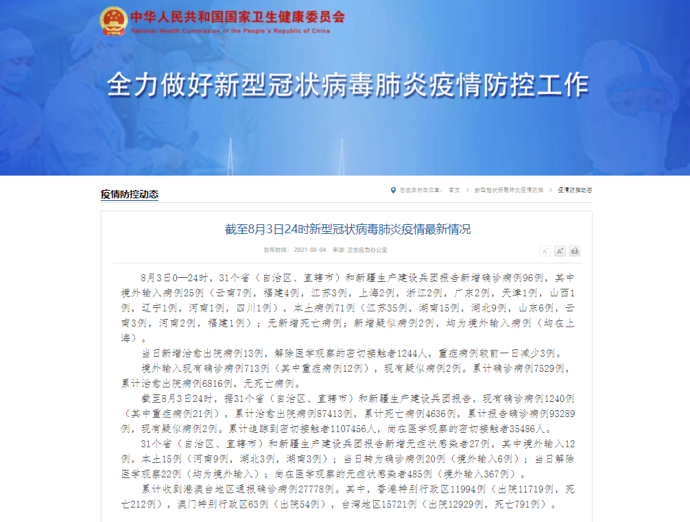 香港新聞網8月4日電 據國家衛生健康委員會官方網站消息,8月3日0—24時,31個省(自治區、直轄市)和新疆生產建設兵團報告新增確診病例96例,其中境外輸入病例25例(雲南7例,福建4例,江蘇3例,上海2例,浙江2例,廣東2例,天津1例,山西1例,遼寧1例,河南1例,四川1例),本土病例71例(江蘇35例,湖南15例,湖北9例,山東6例,雲南3例,河南2例,福建1例);無新增死亡病例;新增疑似病例2例,均為境外輸...