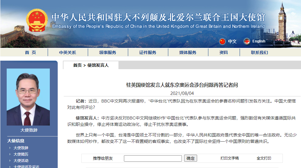 香港新聞網8月4日電 近日,BBC中文網再次報道稱,“中華台北”代表隊因為在東京奧運會的參賽名稱問題引發各方關注。對此,中國駐英大使館發言人今日(4日)表示,中方堅決反對BBC中文網繼續炒作“中華台北”代表隊參與東京奧運會問題,強烈敦促有關媒體遵循國際共識和職業操守,停止將體育運動政治化,停止干擾東京奧運賽事。 發言人強調,世界上只有一個中國,台灣是中國領土不可分割的一部分,中華人民共和國政府是代表全中國的唯一...