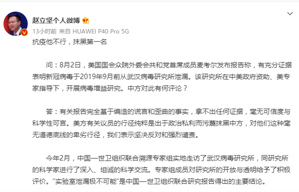 趙立堅批美國議員:抗疫他不行,抹黑第一名
