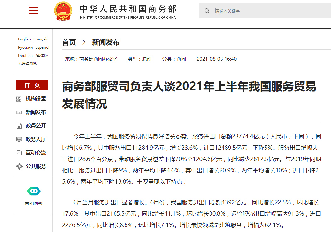 中國商務部:上半年服務進出口同比增長6.7% 更多利好可期