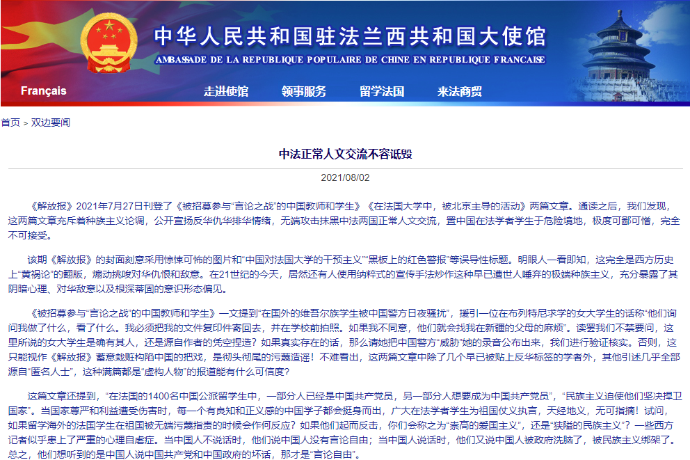 香港新聞網8月3日電 8月2日,中國駐法大使館發文《中法正常人文交流不容詆毀》稱,《解放報》2021年7月27日刊登了《被招募參與“言論之戰”的中國教師和學生》《在法國大學中,被北京主導的活動》兩篇文章。通讀之後,我們發現,這兩篇文章充斥著種族主義論調,公開宣揚反華仇華排華情緒,無端攻擊抹黑中法兩國正常人文交流,置中國在法學者學生於危險境地,極度可鄙可憎,完全不可接受。 該期《解放報》的封面刻意採用驚悚可怖的圖...