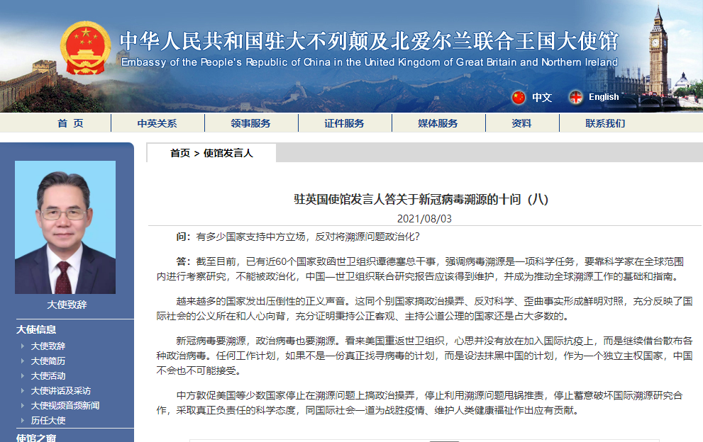 香港新聞網8月3日電 據中國駐英國大使館網站消息,駐英國使館發言人就新冠病毒溯源問題答記者問。 問:有多少國家支持中方立場,反對將溯源問題政治化? 答:截至目前,已有近60個國家致函世衛組織譚德塞總幹事,強調病毒溯源是一項科學任務,要靠科學家在全球範圍內進行考察研究,不能被政治化,中國—世衛組織聯合研究報告應該得到維護,並成為推動全球溯源工作的基礎和指南。 越來越多的國家發出壓倒性的正義聲音。這同個別國家搞...