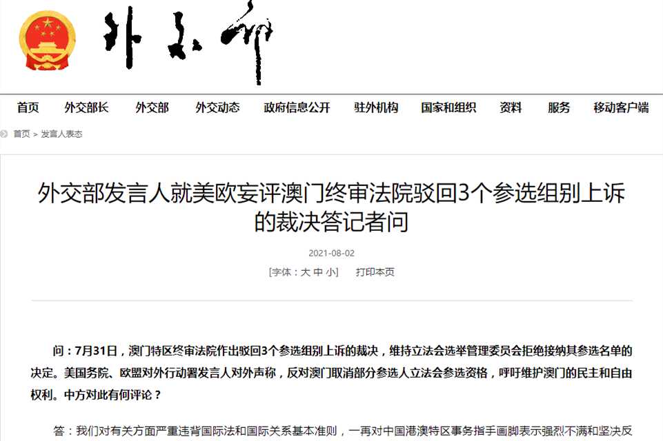 香港中通社8月2日電 據中國外交部網站8月2日消息,外交部發言人就美歐妄評澳門終審法院駁回3個參選組別上訴的裁決一事回應指,中方對有關方面嚴重違背國際法和國際關係基本準則,一再對中國港澳特區事務指手劃腳表示強烈不滿和堅決反對。 有記者提問關於7月31日,澳門特區終審法院作出駁回3個參選組別上訴的裁決,維持立法會選舉管理委員會拒絕接納其參選名單的決定。美國務院、歐盟對外行動署發言人對外聲稱,反對澳門取消部分參選人...
