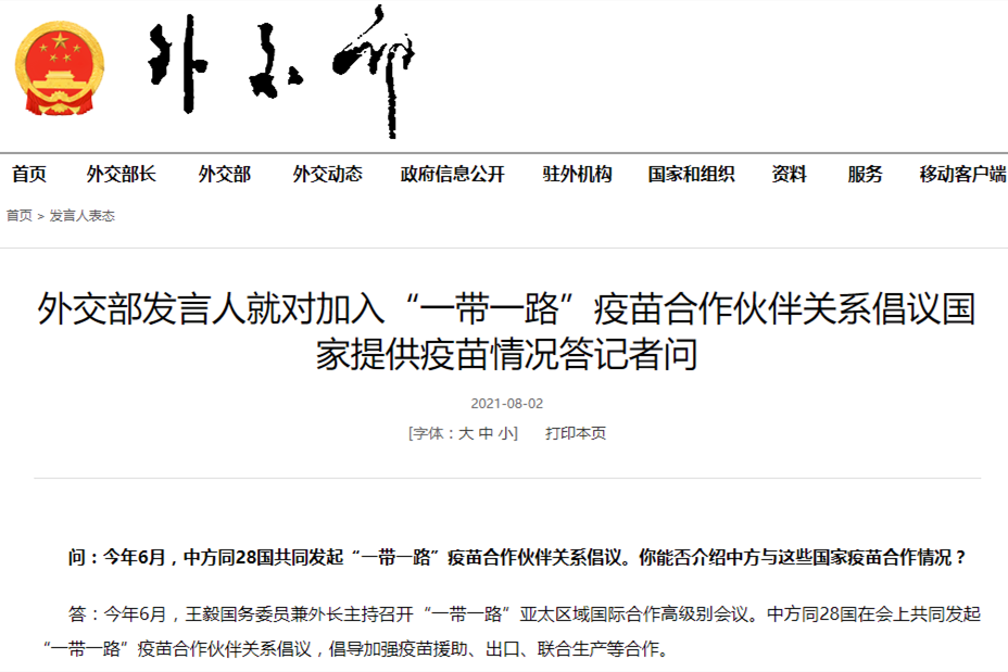 香港新聞網8月3日電 據中國外交部網站8月2日消息,外交部發言人2日就對加入“一帶一路”疫苗合作夥伴關係倡議國家提供疫苗情況回答記者提問。 發言人說,今年6月,國務委員兼外長王毅主持召開“一帶一路”亞太區域國際合作高級別會議。中方同28國在會上共同發起“一帶一路”疫苗合作夥伴關係倡議,倡導加強疫苗援助、出口、聯合生產等合作。 發言人說,中方積極落實上述倡議,已同倡議共同發起國達成了總量7.75億劑疫苗和原液的...