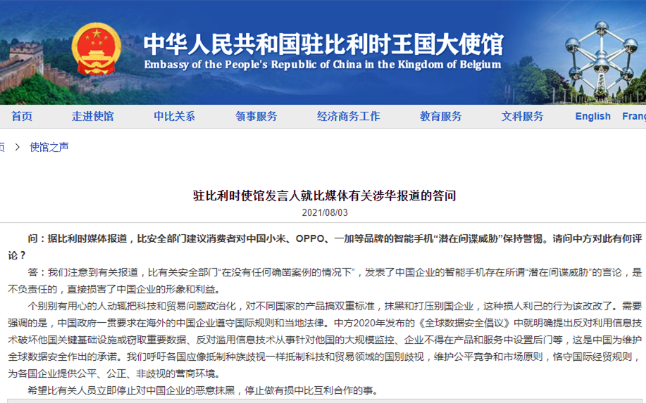 香港新聞網8月3日電 據中國駐比利時大使館網站8月3日消息,針對比媒體有關涉華報道,駐比利時使館發言人3日指出,比有關安全部門“在沒有任何確鑿案例的情況下”,發表了中國企業的智能手機存在所謂“潛在間諜威脅”的言論,是不負責任的,直接損害了中國企業的形象和利益。 有記者援引比利時媒體報道提問稱,比安全部門建議消費者對中國小米、OPPO、一加等品牌的智能手機“潛在間諜威脅”保持警惕。中方對此有何評論? “我們註意...