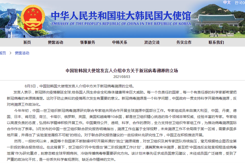中國駐韓國大使館發言人介紹中方關於新冠病毒溯源的立場