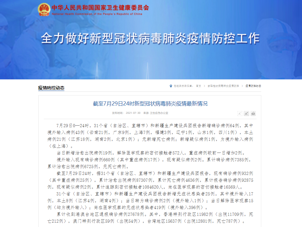 香港新聞網7月30日電 據國家衛健委網站7月30日消息,7月29日0—24時,31個省(自治區、直轄市)和新疆生產建設兵團報告新增確診病例64例,其中境外輸入病例43例(雲南21例,廣東9例,上海7例,福建3例,遼寧1例,山東1例,四川1例),本土病例21例(江蘇18例,湖南2例,北京1例);無新增死亡病例;新增疑似病例1例,為境外輸入病例(在上海)。 當日新增治愈出院病例19例,解除醫學觀察的密切接觸者572...