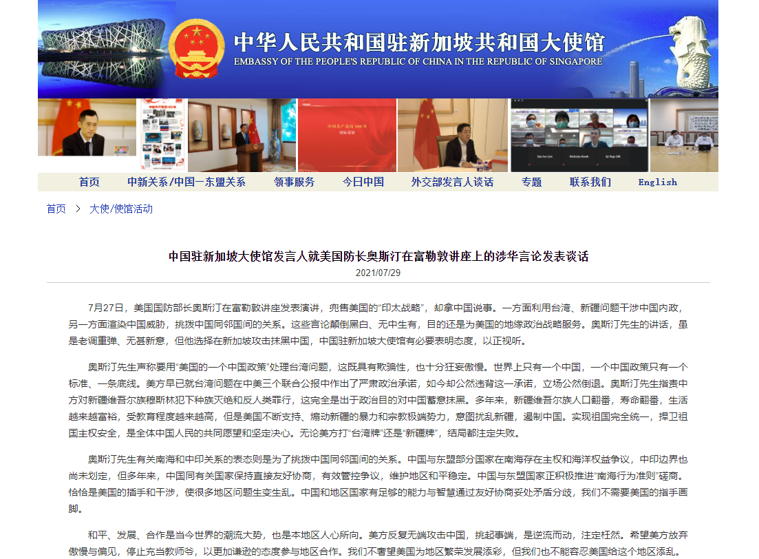 香港中通社7月29日電 中國駐新加坡大使館發言人29日發表談話,批駁美國國防部長奧斯汀日前在新加坡發表的包含涉華言論的演講,指出中國不能容忍美國給地區添亂。 發言人表示,7月27日,美國國防部長奧斯汀在富勒敦講座發表演講,兜售美國的“印太戰略”,卻拿中國說事。一方面利用台灣、新疆問題干涉中國內政,另一方面渲染中國威脅,挑撥中國同鄰國間的關係。這些言論顛倒黑白、無中生有,目的還是為美國的地緣政治戰略服務。 發言...