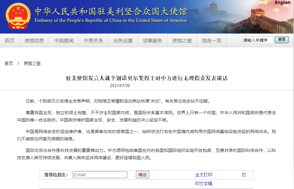 個別諾貝爾獎得主無理指責中方,中國駐美使館回擊