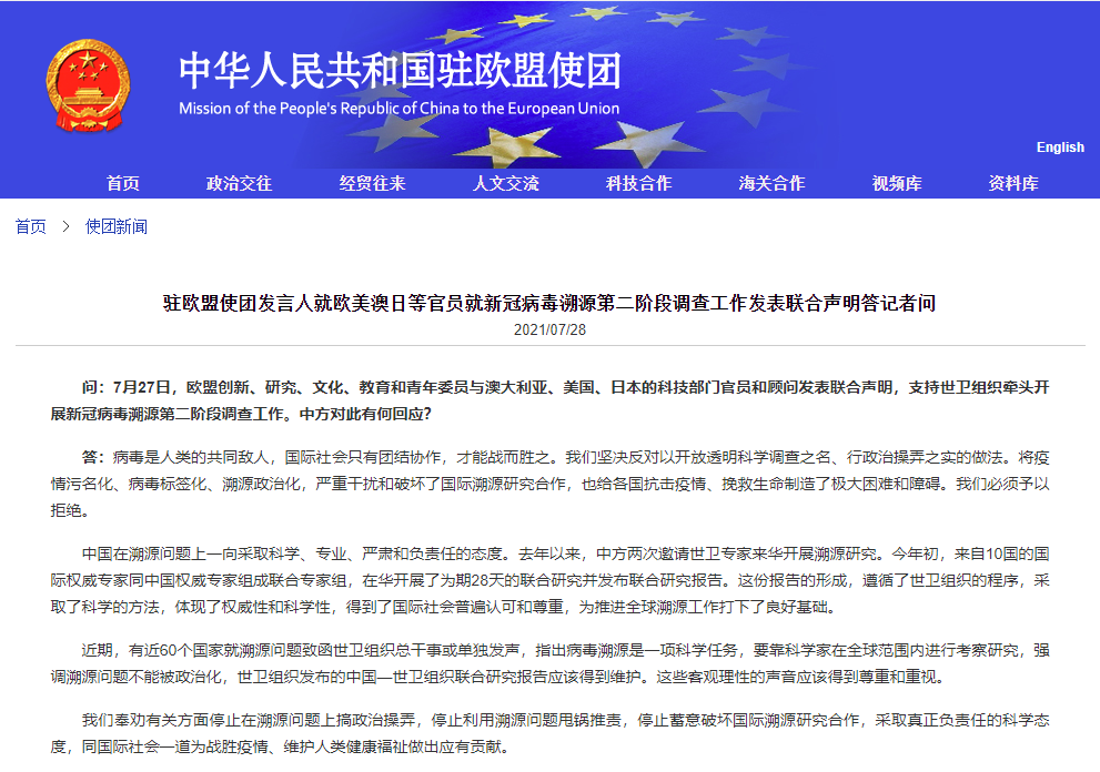 香港新聞網7月28日電 據中國駐歐盟使團網站28日消息,駐歐盟使團發言人就歐美澳日等官員就新冠病毒溯源第二階段調查工作發表聯合聲明答記者問。 問:7月27日,歐盟創新、研究、文化、教育和青年委員與澳大利亞、美國、日本的科技部門官員和顧問發表聯合聲明,支持世衛組織牽頭開展新冠病毒溯源第二階段調查工作。中方對此有何回應? 答:病毒是人類的共同敵人,國際社會只有團結協作,才能戰而勝之。我們堅決反對以開放透明科學調查...