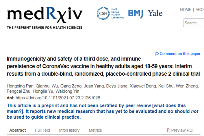 香港新聞網7月28日電 據科興控股生物技術有限公司官方微信公眾號“疫苗之益”7月26日消息,2021年7月25日,由江蘇省疾病預防控制中心疫苗評價所聯合復旦大學公共衛生學院、科興控股生物技術有限公司(SINOVAC科興)、復旦大學附屬華山醫院等多家單位合作,在健康科學預印本論文平台Medrxiv上傳了題為《18-59歲健康成年人接種克爾來福®第三劑的免疫原性和安全性,以及免疫持久性:雙盲、隨機、安慰劑對照的Ⅱ期臨...