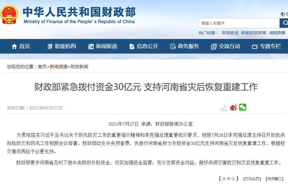 香港新聞網7月28日電 據中國財政部網站27日消息,為貫徹落實習近平總書記關於防汛救災工作的重要指示精神和李克強總理重要批示要求,按照7月26日李克強總理主持召開的抗洪搶險救災和防汛工作視頻會議部署,財政部動支中央預備費,先撥付河南省財力補助資金30億元支持河南省災後恢復重建工作,根據核災情況再給予必要支持。 財政部要求河南省及時下撥中央財政補助資金,切實加強資金監管,充分發揮資金效益,做好洪澇災害救災和災後恢...