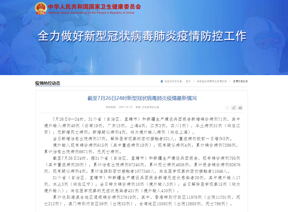 香港新聞網7月27日電 據國家衛生健康委員會官方網站消息,7月26日0—24時,31個省(自治區、直轄市)和新疆生產建設兵團報告新增確診病例71例,其中境外輸入病例40例(雲南19例,廣東13例,上海4例,江蘇3例,四川1例),本土病例31例(均在江蘇);無新增死亡病例;新增疑似病例4例,均為境外輸入病例(均在上海)。 當日新增治愈出院病例17例,解除醫學觀察的密切接觸者331人,重癥病例較前一日增加3例。 ...