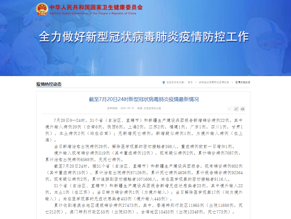 香港新聞網7月21日電 據國家衛生健康委員會官方網站消息,7月20日0—24時,31個省(自治區、直轄市)和新疆生產建設兵團報告新增確診病例22例,其中境外輸入病例20例(雲南6例,陜西6例,上海2例,江蘇2例,福建1例,廣東1例,四川1例,甘肅1例),本土病例2例(均在雲南);無新增死亡病例;新增疑似病例1例,為境外輸入病例(在上海)。 當日新增治愈出院病例28例,解除醫學觀察的密切接觸者398人,重癥病例較...