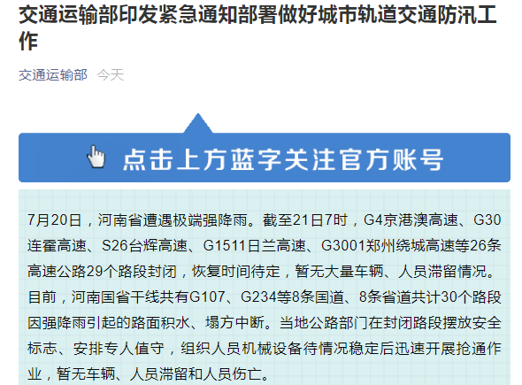 中國交通運輸部:河南8條國道8條省道出現路面積水、塌方