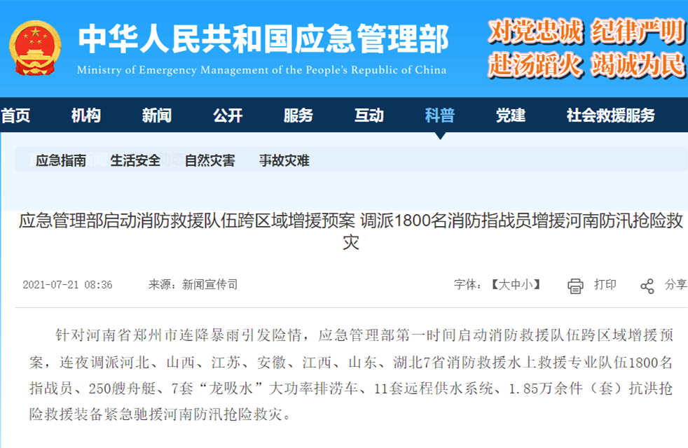 中國應急部啟動跨區增援預案,調1800名消防指戰員馳援河南